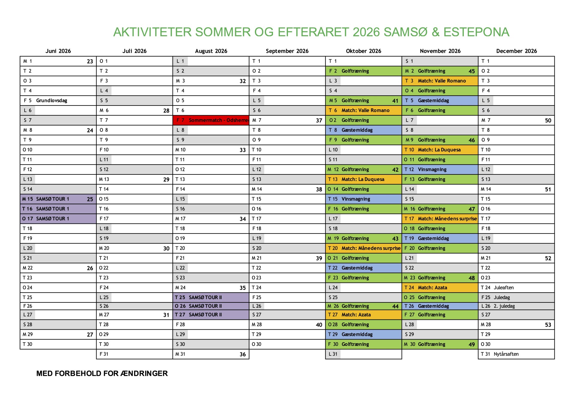 Aktiviteter generelt: 3 gange om ugen golf fællestræning på Valle Romano som er inkluderet i alle vore pakker.- desuden ugentlige matcher - fællesspisning 1 gang om ugen - ture i bjergene - vinsmagning - kokkeskole mm.